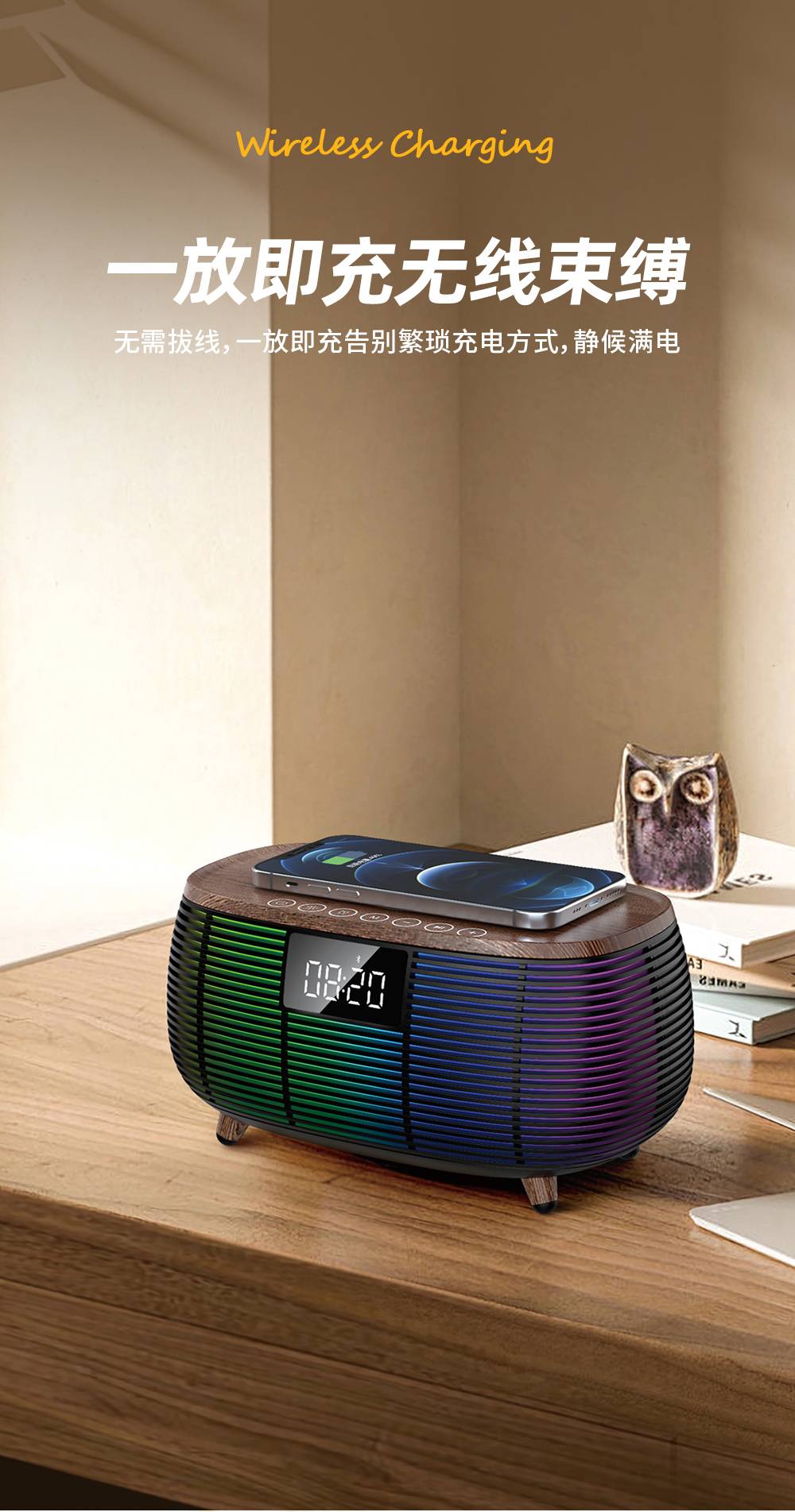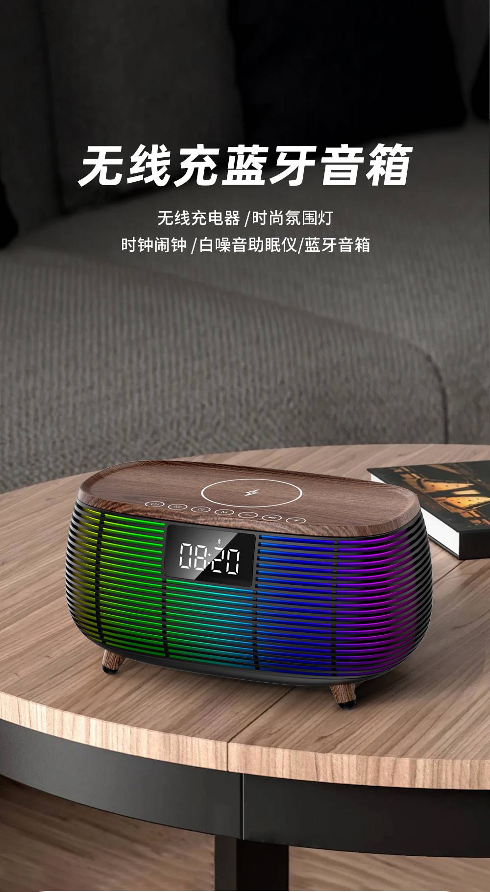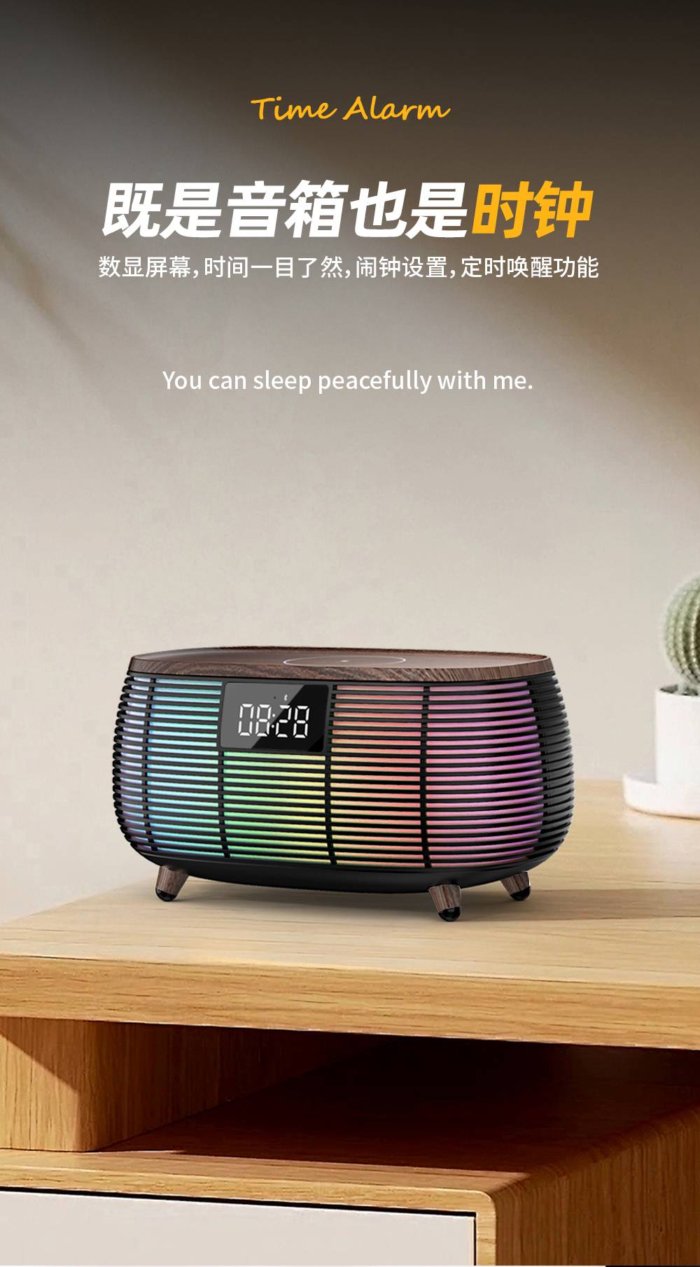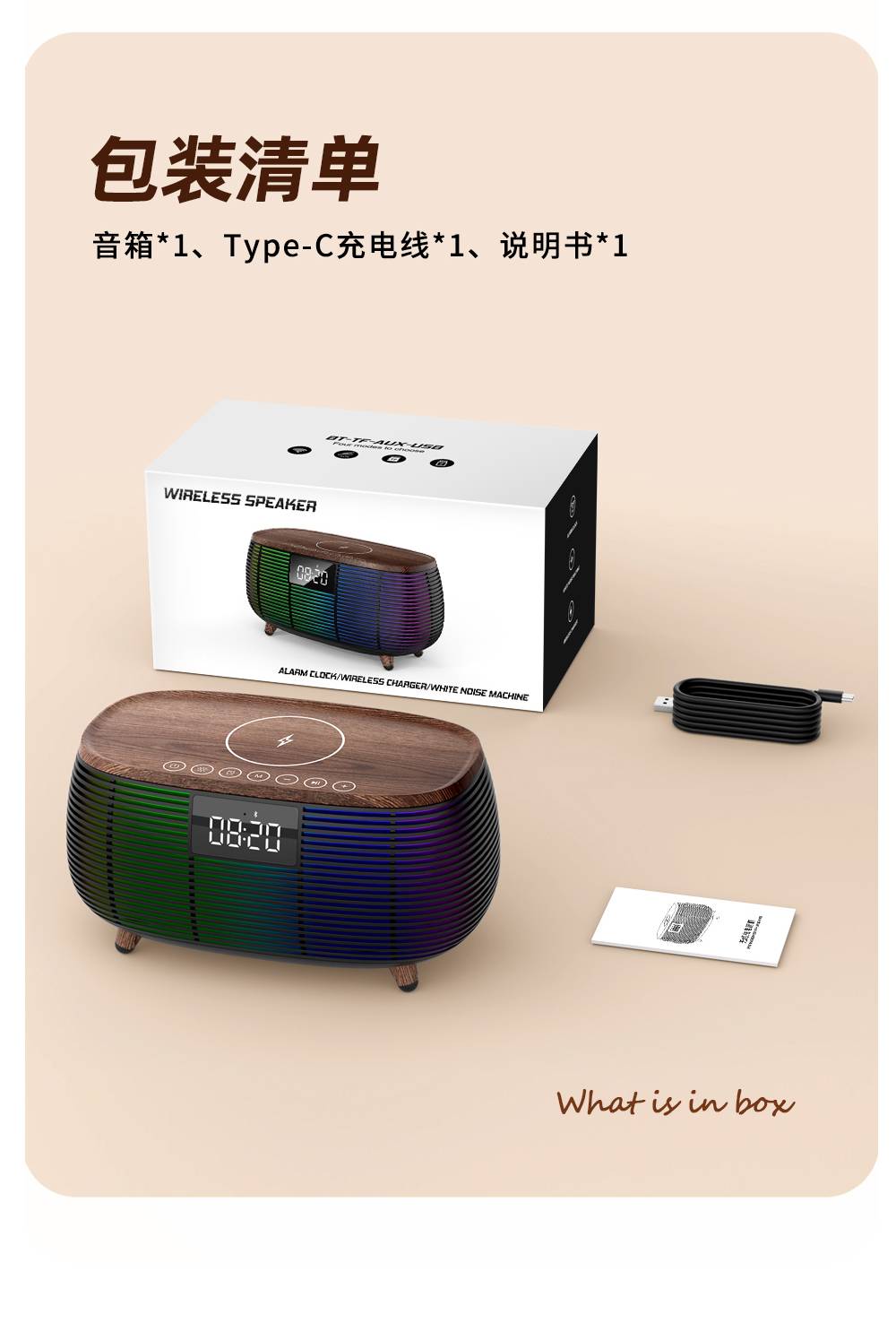 Features: Bluetooth, Handsfree Call, TWS Support, Color-Changing RGB Lights, TF Card Slot, Aux Input, U-Disk Playback (Powerbank), Wireless Charging (Max. 15W), White Noise Sound Built-in, Alarm Clock