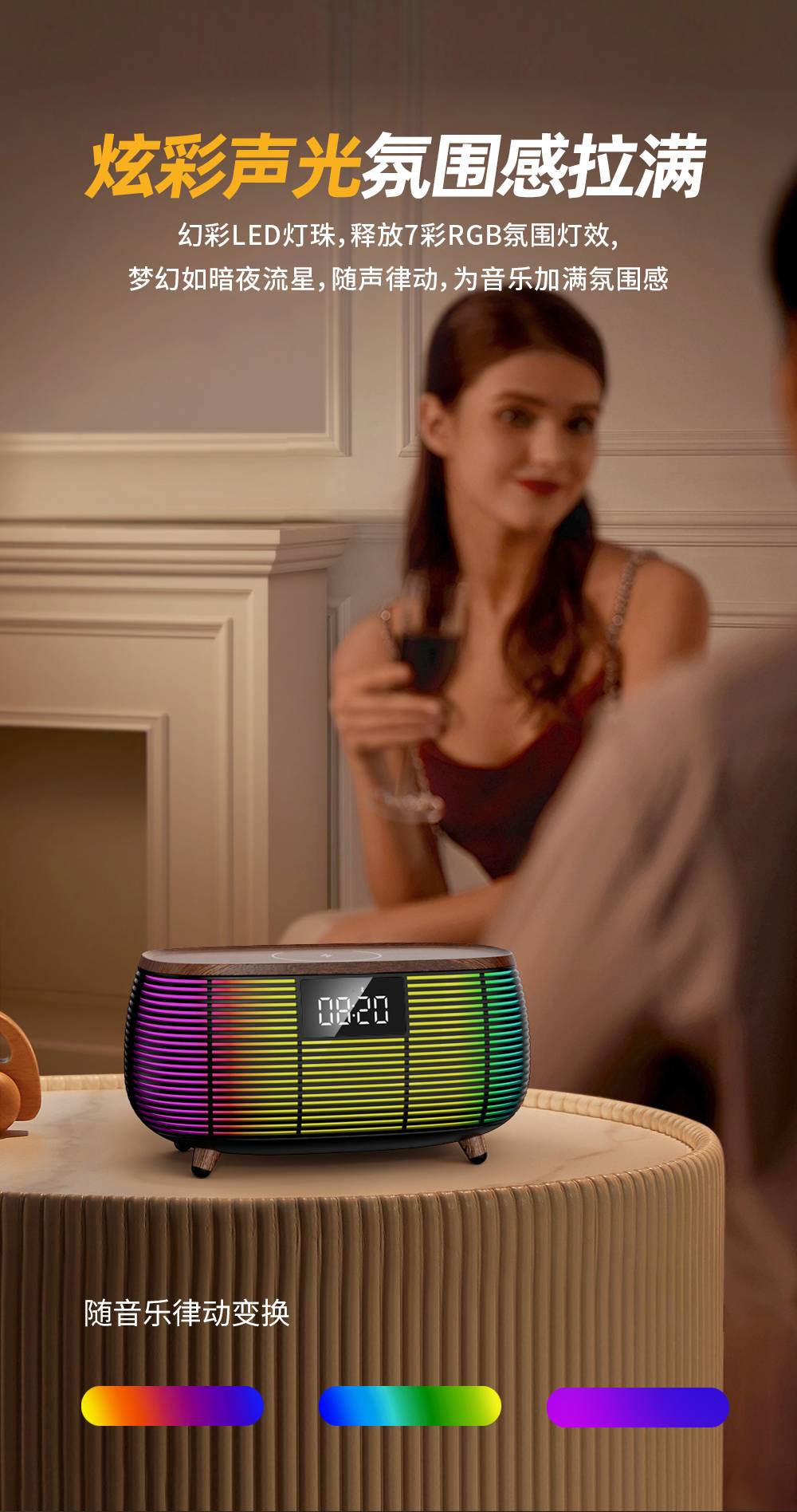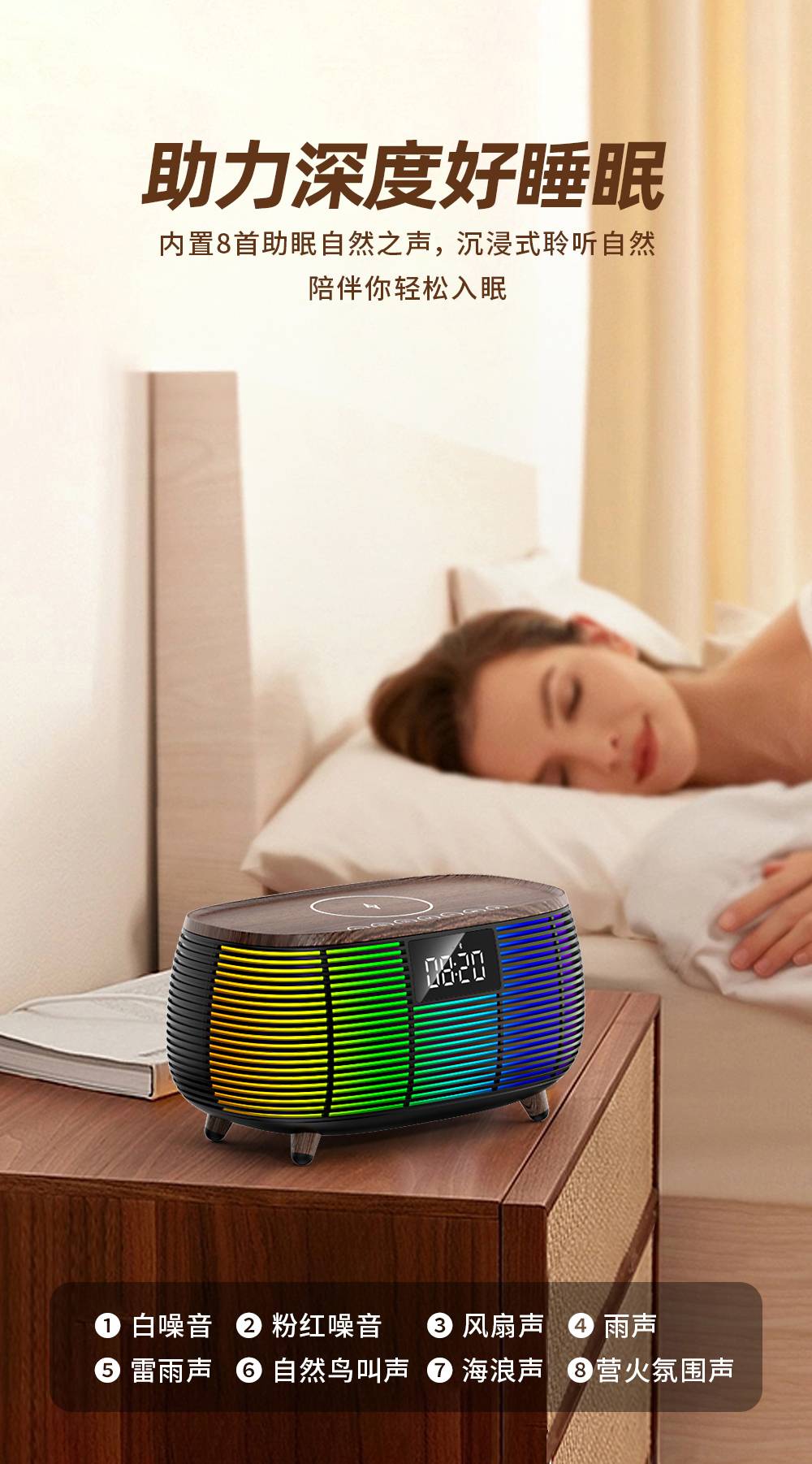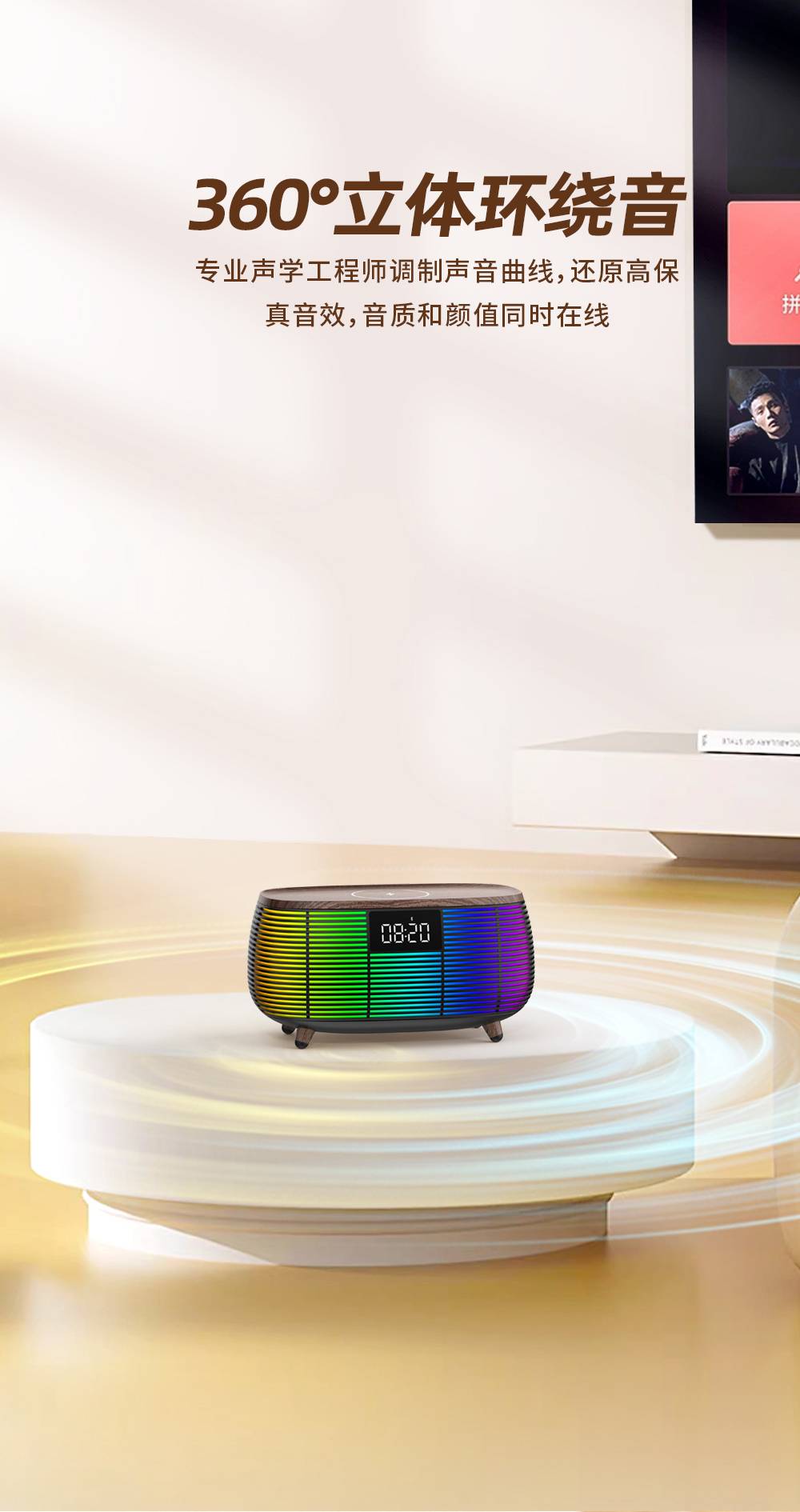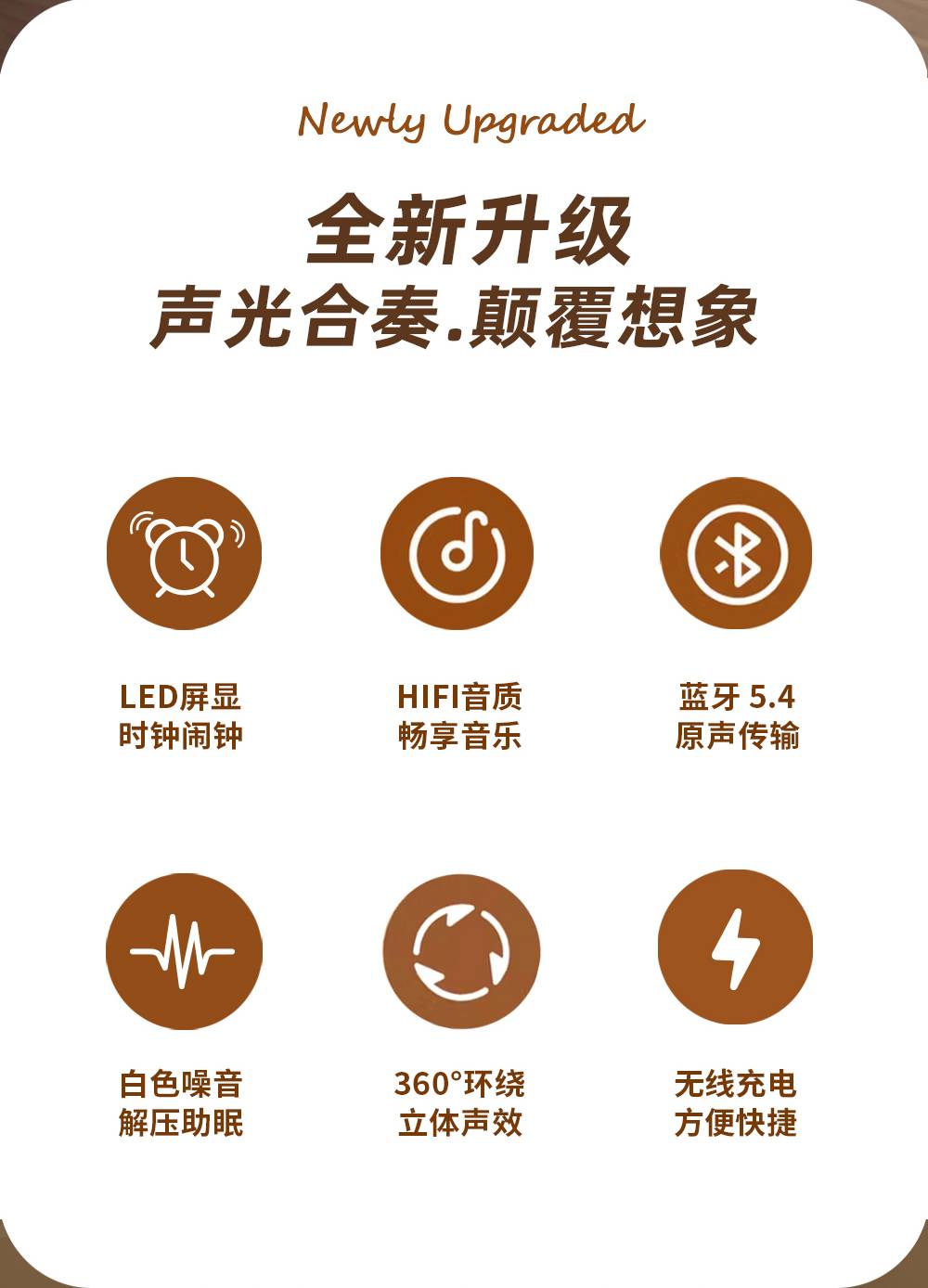 Features: Bluetooth, Handsfree Call, TWS Support, Color-Changing RGB Lights, TF Card Slot, Aux Input, U-Disk Playback (Powerbank), Wireless Charging (Max. 15W), White Noise Sound Built-in, Alarm Clock