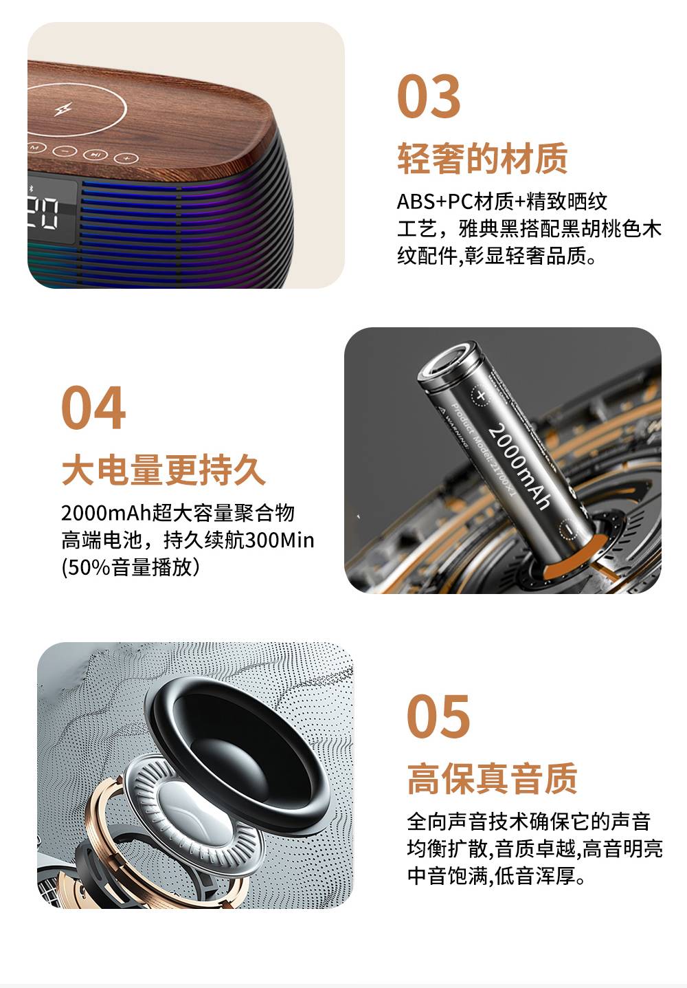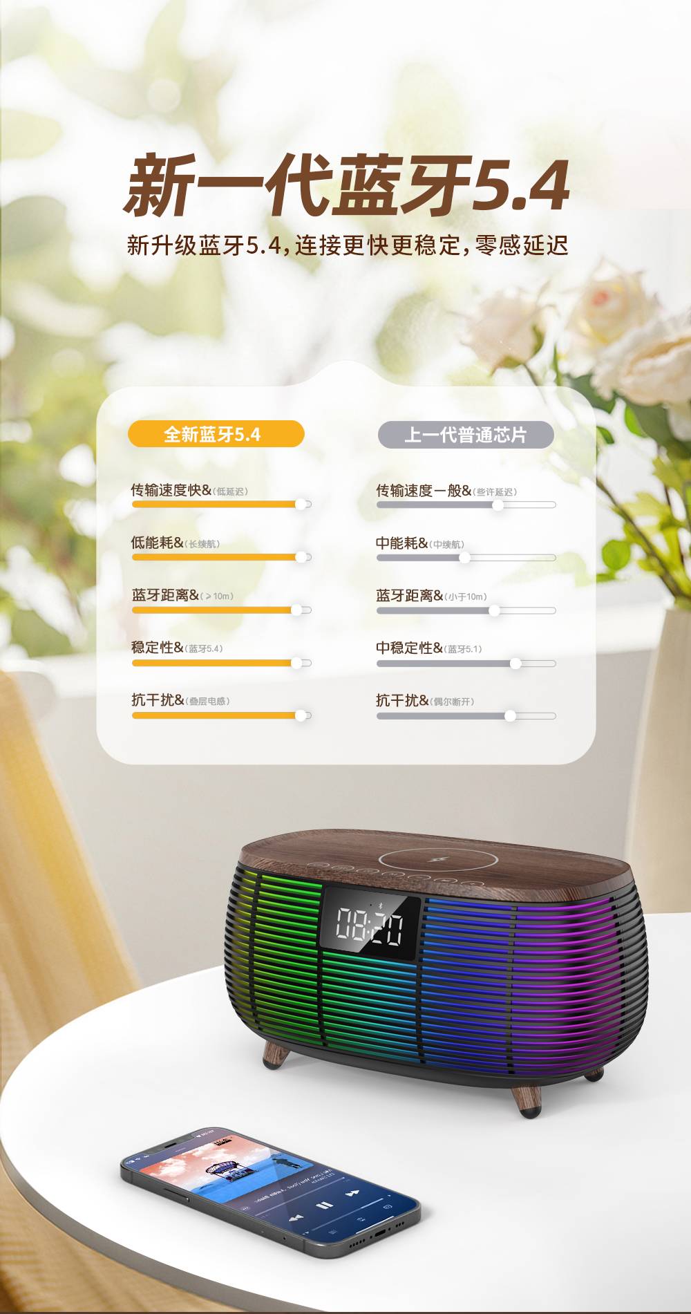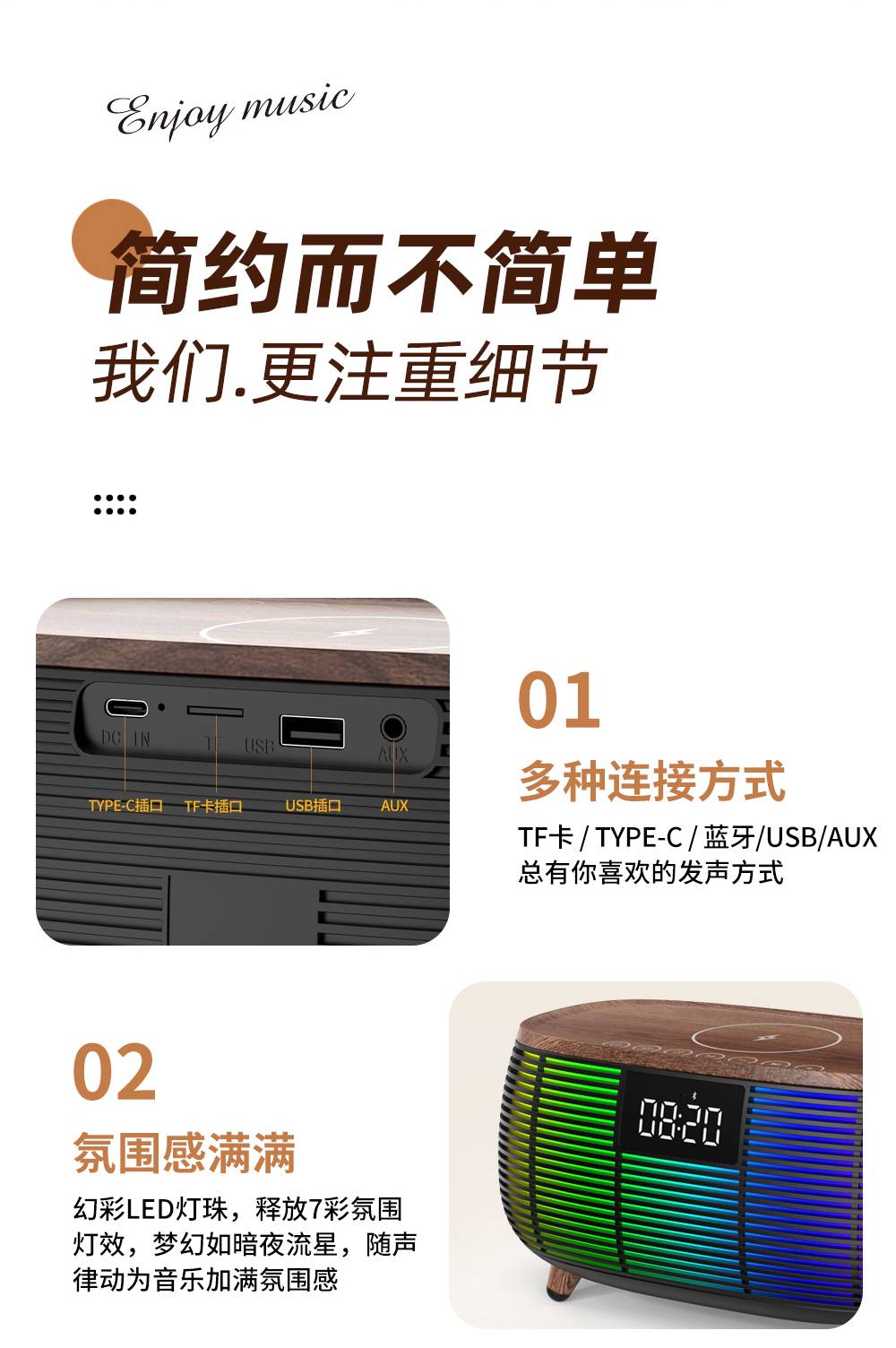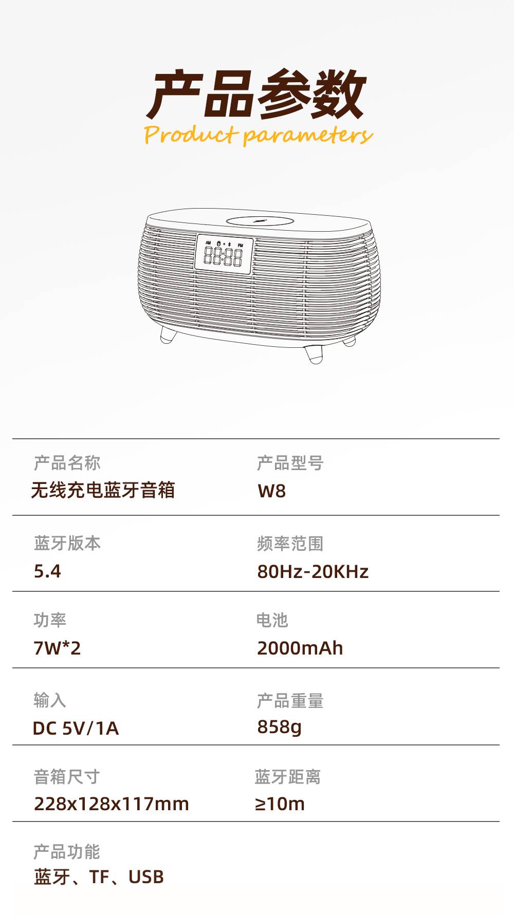 Features: Bluetooth, Handsfree Call, TWS Support, Color-Changing RGB Lights, TF Card Slot, Aux Input, U-Disk Playback (Powerbank), Wireless Charging (Max. 15W), White Noise Sound Built-in, Alarm Clock